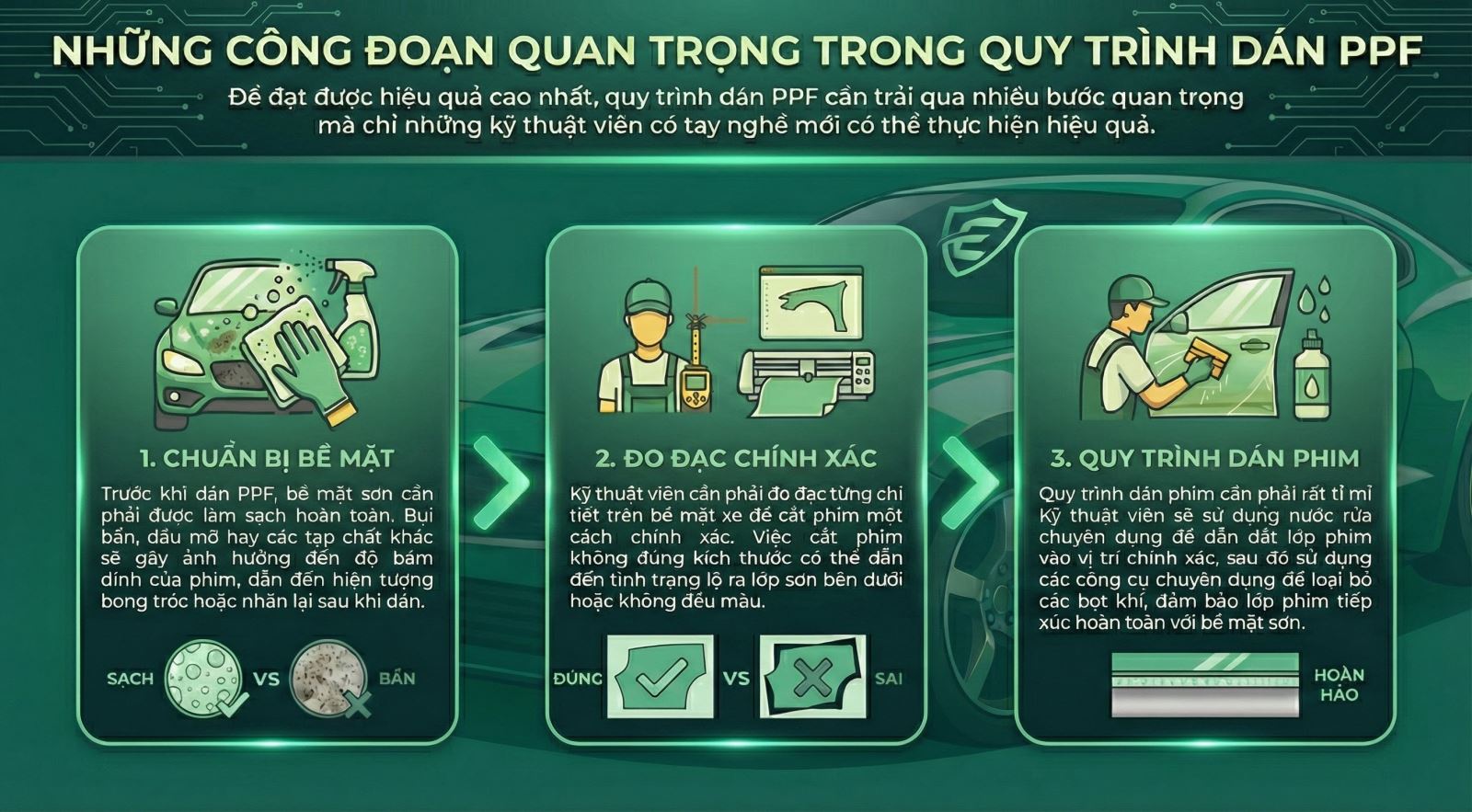 Mặc dù việc lựa chọn phim PPF đắt tiền có thể mang lại một số lợi ích nhất định, nhưng tay nghề của kỹ thuật viên lại là yếu tố quyết định đến sự thành công của lớp phủ. Có thể chia ra các khía cạnh mà tay nghề kỹ thuật viên tác động đến hiệu quả của lớp dán PPF như sau: