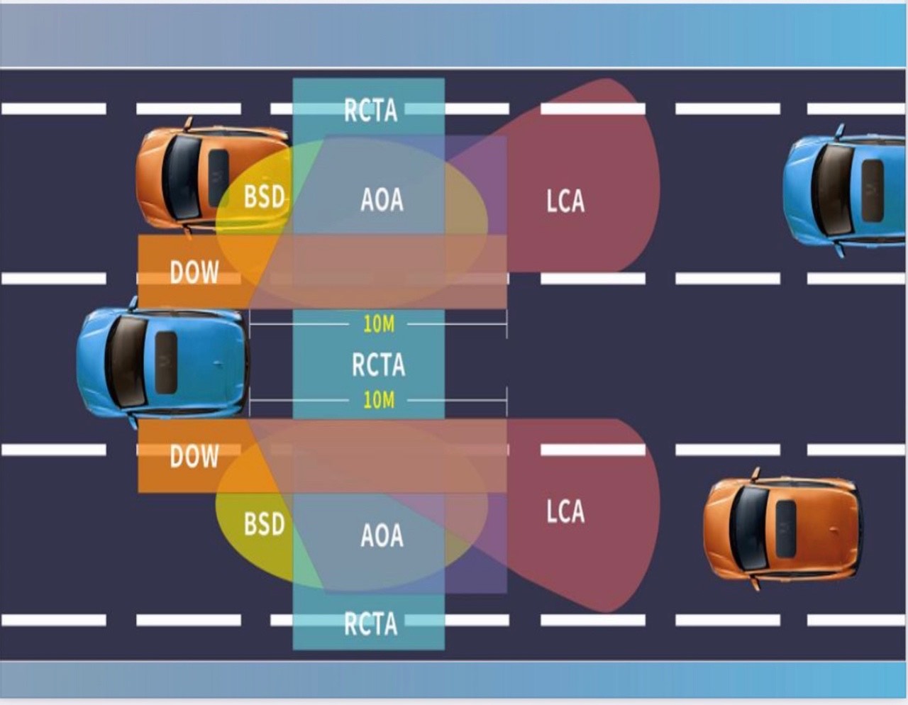 - Khởi động ở số lùi, hệ thống sẽ quét tìm kiếm phương tiện mục tiêu ở xung quanh phía sau xe - Nếu có mục tiêu tốc độ hơn 1m/s tiếp cận theo chiều ngang, còi và đèn cảnh báo sẽ báo động cùng một lúc - Phạm vi radar quét: 7 mét ở bên trái và bên phải, với thời gian va chạm tương đối là 5 giây